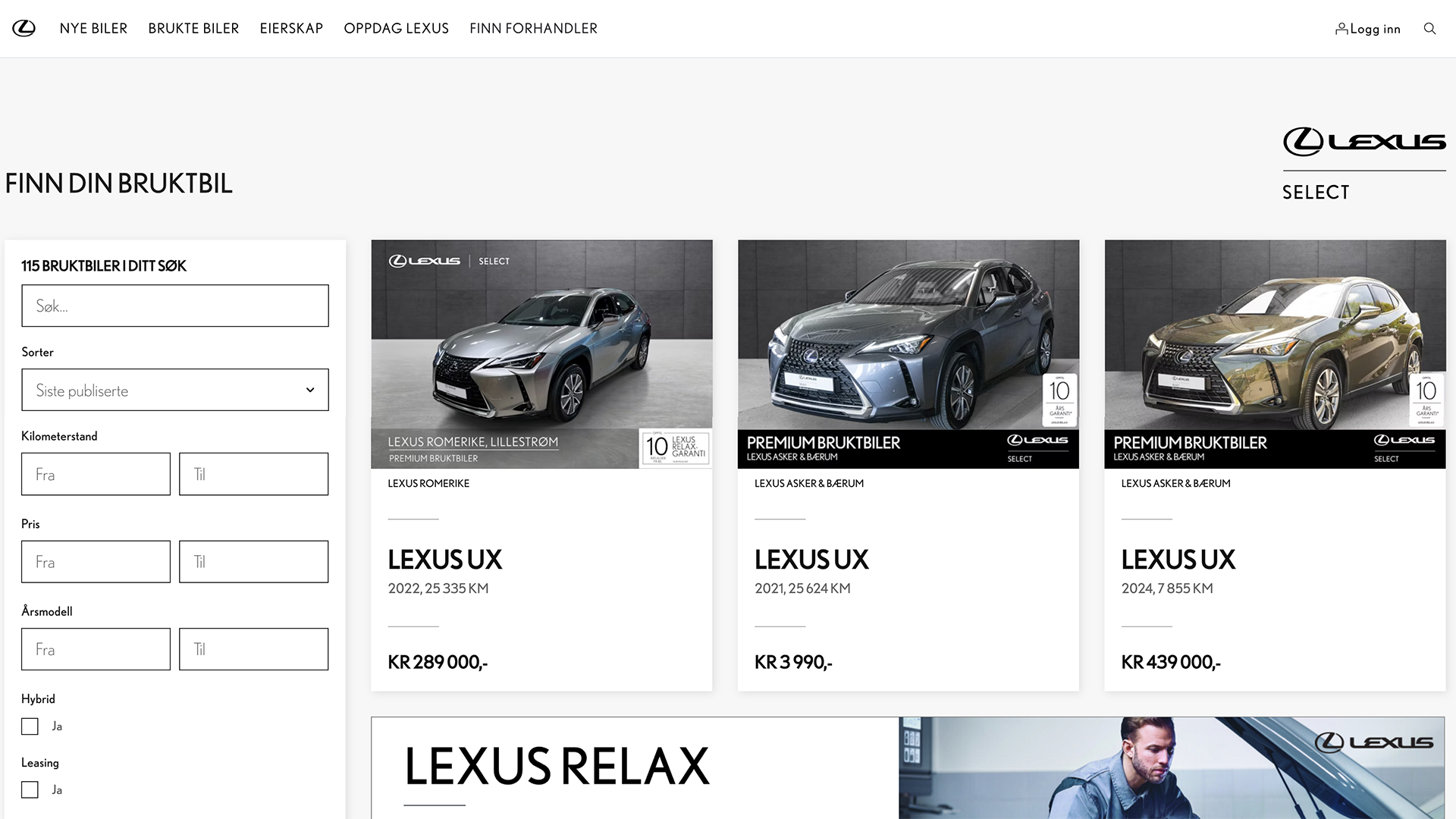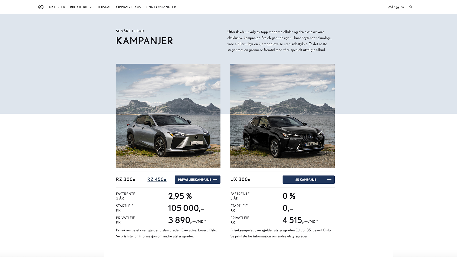 Prosjektet gikk ut på å optimalisere lexus.no med fokus på en sømløs brukeropplevelse. Gjennom helhetlig UX/UI-design ble struktur og navigasjon løftet for å gjøre det enklere og mer intuitivt å utforske Lexus-universet. Resultatet ble svært godt mottatt, og lexus.no ble kåret til den beste Lexus-siden i Europa i en intern evaluering. Nettsiden høstet også ros fra øverste hold – Toyota-president Piotr Pawlak uttalte: «Whoever's the UX-team behind lexus.no, I want the same done for Toyota's websites.»